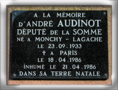André Audinot, homme politique français est né le 23 septembre 1933 à Monchy-Lagache, Député de la 5e circonscription de la Somme sans interruption depuis mars 1973, Il est décédé le 18 avril 1986, en cours de mandat, à Paris.